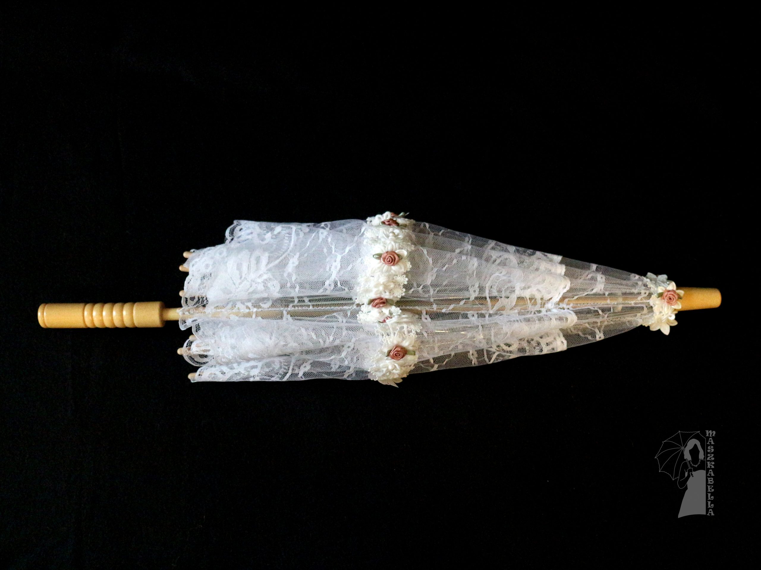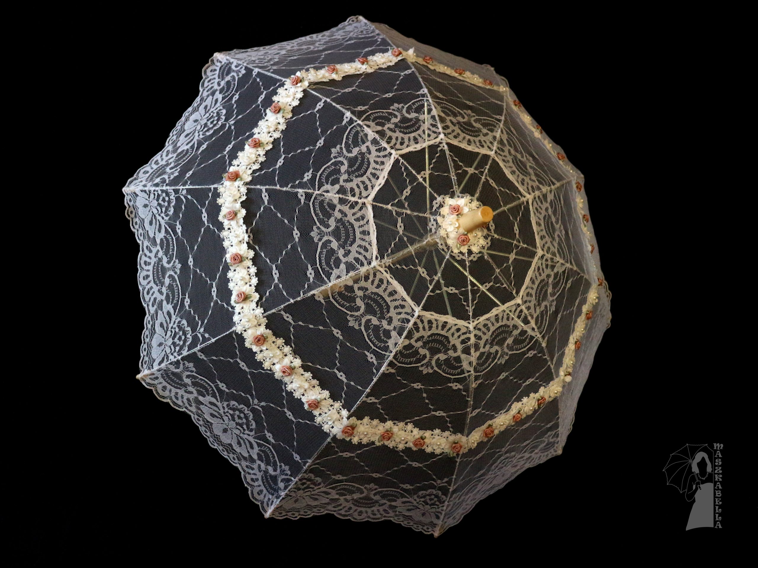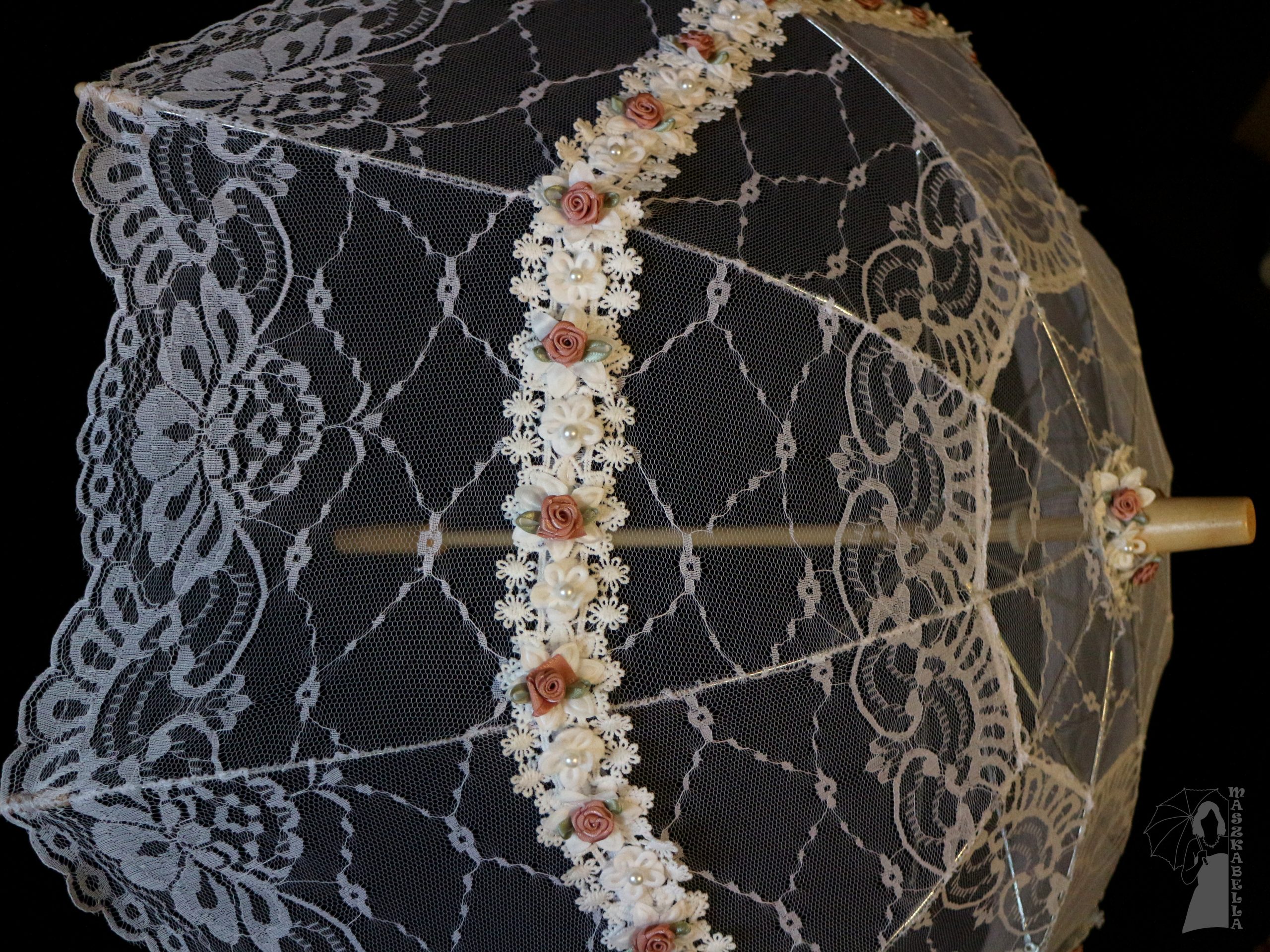 Az ernyő saját készítésű, anyaga csipke mályva és fehér virág rátéttel.